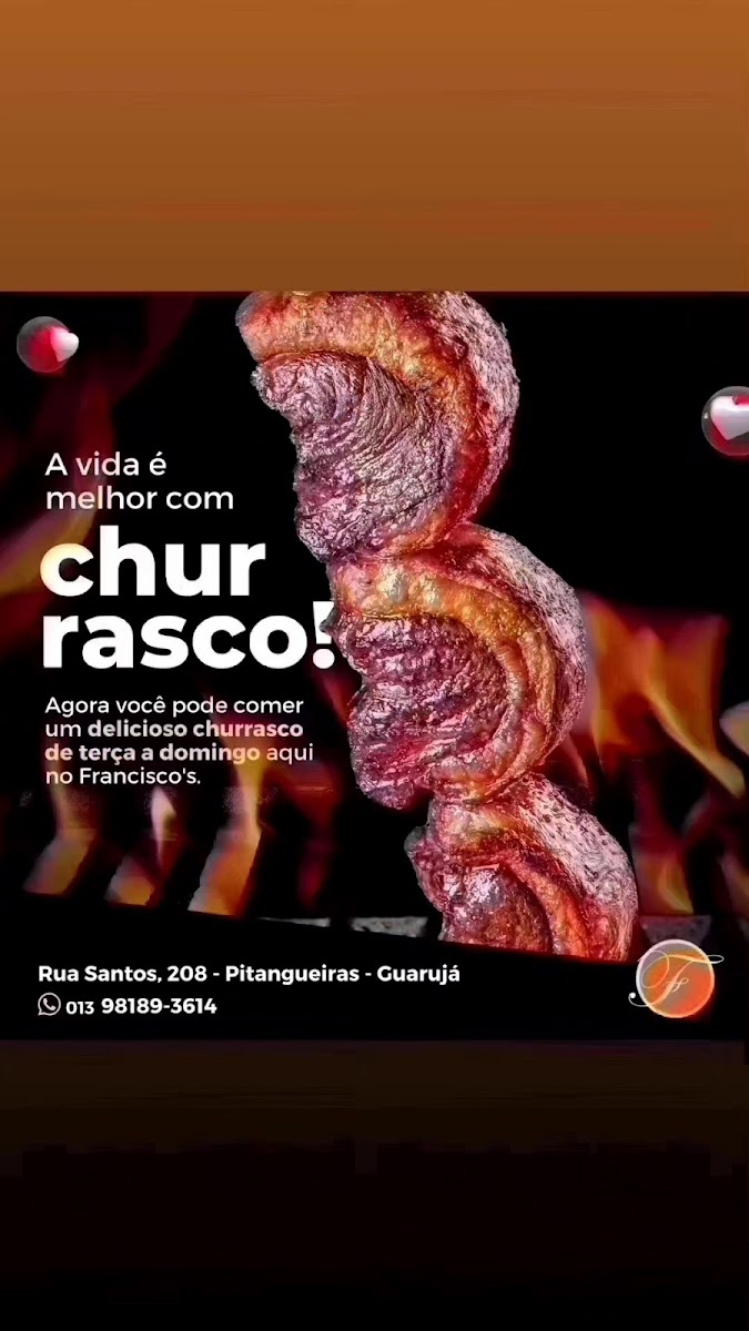 Welcome to Francisco's Restaurante, a gem nestled in Guarujá, Brazil, where the essence of Brazilian cuisine shines through! This charming eatery offers a diverse menu featuring mouthwatering churrasco, fresh seafood, and vegetarian options, all crafted with love and care. Diners rave about the delicious salmon, a highlight that showcases the chef's dedication to quality. The inviting ambiance is perfect for family gatherings or casual meals, enhanced by top-notch service—a common praise from customers.